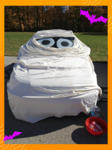 Esta opción requiere poco esfuerzo y materiales, puede ser utilizada también para replicar la figura de un fantasma. Solo se necesitará una tela amplia o sábanas blancas, que cubran por completo el vehículo. El toque lo darán los ojos que pueden ser de papel.